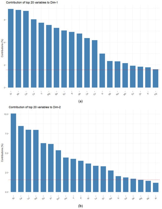 Contributions of the top 20 variables to the first and second components, in decreasing order of strength. The red line indicates the expected average donation of each variable: (a) first dimension; (b) second dimension.