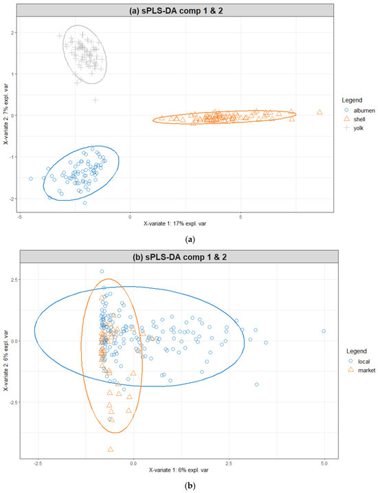 Next, a Partial Least Squares Discriminant Analysis (PLS-DA) was performed with feature selection to differentiate samples based on (a) each egg part and (b) the laying hen’s growing system. PLS-DA is a statistical method commonly used for analyzing high-dimensional data with a categorical response variable and has been successfully applied in numerous chemometric analyses for discriminating various food products [57,58,59,60].
