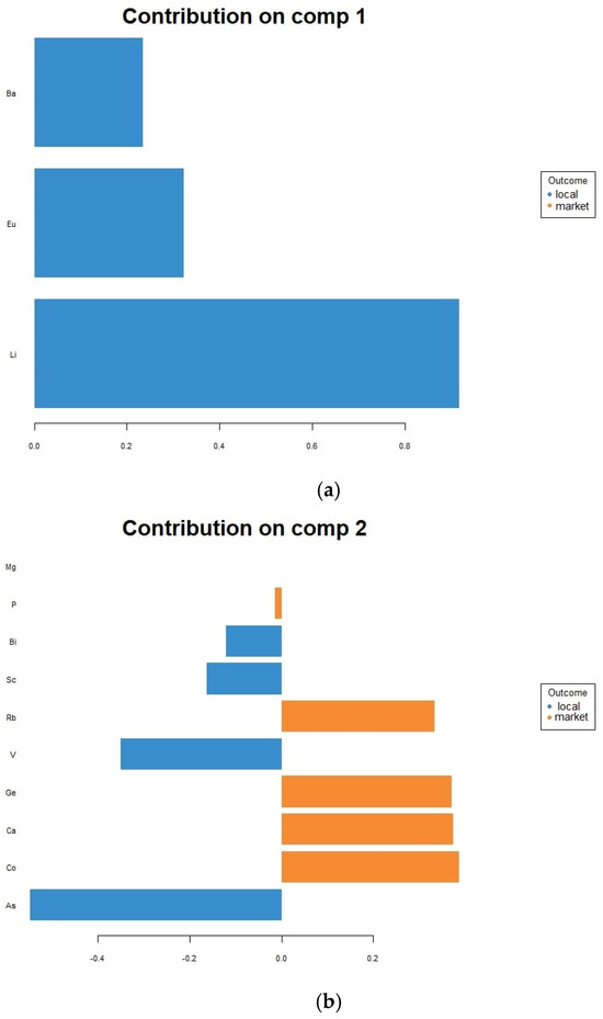 In the case of identifying the hen rearing system from which the egg comes, the PLS-DA model achieved 80% accuracy, 80% sensitivity, and 85% specificity with three components and 17 variables (Figure 5). Among these variables with the highest discriminatory potential are Li, Eu, and Ba (in decreasing order of strength), whose content contributed the most to the first component, and with Li being strongly associated with the local produced samples. On the second component, As, V, Sc, and Bi contents were associated again with the local egg samples, while Co, Ca, Ge, Rb, and Mg contents were associated with the market samples. Lastly, Rb was strongly linked with the market eggs on the third component, followed by Hg and K. Ba only had a mild association with the local egg samples.