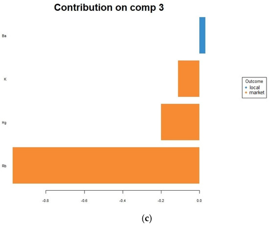 Contributions of elements to the first three components of the final PLS-DA model for differentiating between market and local egg samples: (a) first component; (b) second component; (c) third component.