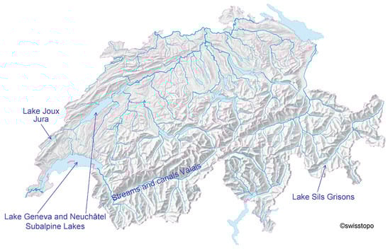 Contamination of wild fish species with PFASs was determined for different regions of Switzerland: the sampling sites ranged from the high alpine Lake Sils in the canton of Grisons over alpine and subalpine streams and canals in the canton of Valais and Lake Joux, in the medium mountain range Jura, down to the large subalpine lakes Geneva and Neuchâtel in western Switzerland which are densely populated areas and surrounded by agriculture and industry. The sampling regions are illustrated in Figure 1. No samples originating from areas highly contaminated with PFAS are reported here. Due to the different fish habitats, it was not possible to systematically obtain samples of the same fish species from various waters.