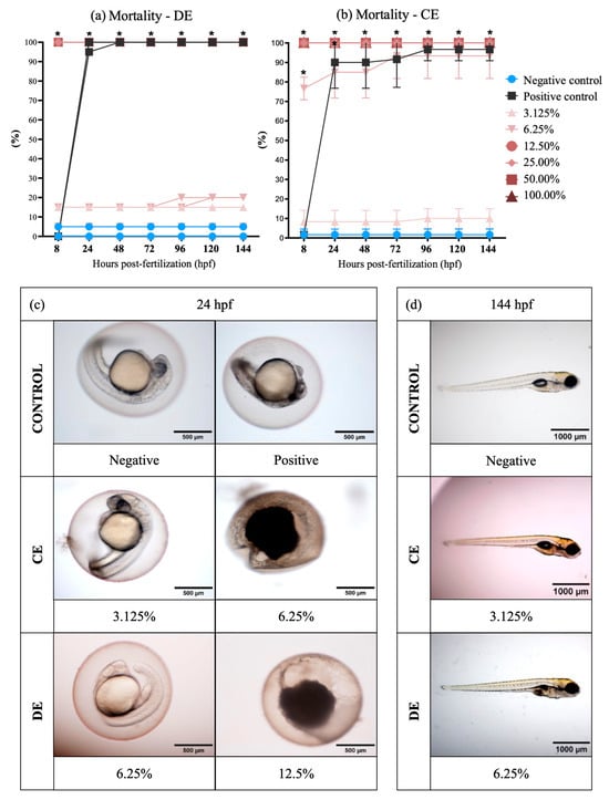 Mortality in zebrafish (Danio rerio) embryos. (a,b) Graphic representation of zebrafish embryo and larvae mortality, expressed by the proportion of coagulated eggs and absence of heartbeats per effluent, concentration, and exposure time. The negative control corresponds to the healthy embryos not exposed to effluents. Significant mortality of exposed zebrafish (p ≤ 0.05) relative to the control is identified with (*). Prepared with GraphPad Prism 5.01 software. (c) Micrographs showing zebrafish mortality: at the 6.125% dilution compared to negative control and the 3.125% dilution in the associated effluent (CE); and at the 12.5% dilution compared to the negative control and the 6.25% dilution in the non-associated effluent (DE) (2× magnification on MVX10 microscope, Olympus, Tokyo, Japan). Photographs are representative (n = 3) and were taken at 24 hpf. (d) Micrographs showing zebrafish survival from dilutions of 3.125% in the associated effluent (CE) and 6.25% in the non-associated effluent (DE) at the end of the exposure (1.6× magnification on Olympus MVX10 microscope). Photographs are representative (n = 3) and were taken at 144 hpf.