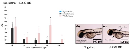 In addition, edema of the pericardium and yolk sac was observed after 72 hpf when exposed to 6.25% of DE. According to the literature, edema is characterized as an abnormal accumulation of fluid in any tissue of the body []. The appearance of pericardial edema may be associated with cardiac dysfunction, acting as an indicator of osmotic or metabolic dysfunction, which is often correlated with the extravasation of endothelial vessels [,].
