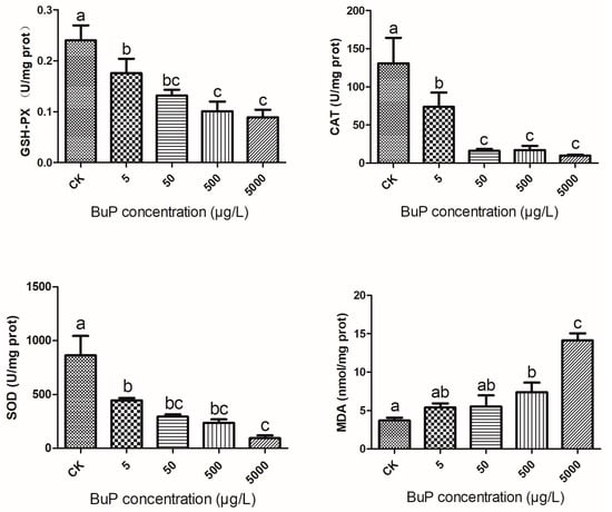 Effect of BuP on the activities of GSH-PX, CAT, and SOD and the content of MDA in the liver of Mauremys sinensis. Note: the different letters indicate significant differences between different groups. This is also the case in future figures.