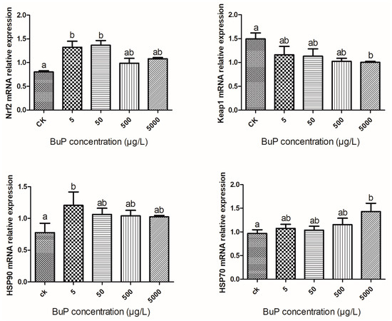 When the exposure concentration of BuP was 5 µg/L, the relative expression of HSP90 was significantly higher than in the control group (p < 0.05). When the concentration of BuP was 5000 µg/L, the relative expression of HSP70 was significantly higher than in the control group (p < 0.05).
