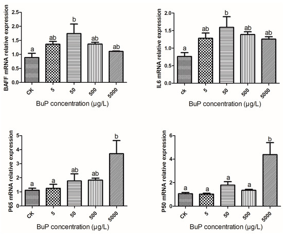 As shown in Figure 3, after 20 weeks of stress, the relative expressions of BAFF and IL-6 in the liver were highest in the 50 µg/L group, while the relative expressions of P65 and P50 were highest in the 5000 µg/L group. When the concentration of BuP was 50 µg/L, the relative expressions of BAFF and IL-6 were significantly higher than in the control group (p < 0.05), and when the concentration of BuP was 5000 µg/L, the relative expressions of P65 and P50 were significantly higher than in the control group (p < 0.05).