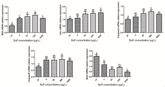 When the concentration of BuP reached 500 µg/L, the relative expression levels of pro-apoptosis genes BAX, Caspase3, and Caspase9 were significantly higher than those in the control group (p < 0.05); when the concentration of BuP reached 500 µg/L, the relative expression level of the pro-apoptosis gene cytc was significantly higher than that in the control group (p < 0.05), while the relative expression levels of the anti-apoptosis gene Bcl2 were significantly lower than in the control (p < 0.05).(Figure 4).