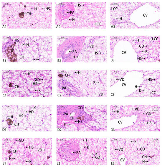 Effect of BuP on the histopathology in the liver of M. sinensis. Notes: (A) control group; (B) 5 g/L BuP group; (C) 50 g/L BuP group; (D) 500 g/L BuP group; (E) 5000 g/L BuP Group. 1, 2,3 mean the different part of the same group. H—hepatocytes; CH—chromatophore; CV—central vein; HS—hepatic sinusoid; PA—portal area; LCC—liver cell cords.