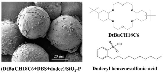 The (DtBuCH18C6 + DBS + dodec)/SiO2-P adsorbent (Figure 1) with DBS modification was synthesized following the rotary vacuum evaporation method []. DtBuCH18C6 (25.5 wt%) and DBS were dissolved in dichloromethane and then mixed with SiO2-P particles in a glass flask and then stirred gently by a rotary evaporator. The SiO2-P particles were synthesized by immobilizing a 20% styrene–divinylbenzene (SDB) copolymer into the SiO2 porous. Sr(NO3)2 was of reagent grade and purchased from Sinopharm Chemical Reagent Co., Ltd, Shanghai, China. Diethylenetriaminepentaacetic acid (DPTA) and diethylenetriaminepentaacetic acid pentasodium salt solution (Na-DTPA) were purchased from Sinopharm Chemical Reagent Co., Ltd, Shanghai, China. The simulated HLLW (SHLLW) containing 3 M HNO3 was prepared, and the main initial concentration of SHLLW is summarized in Table 1.