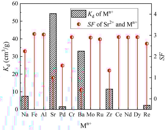The SHLLW with an acidity of 3 M HNO3 was utilized for evaluating the adsorption selectivity of the (DtBuCH18C6 + DBS + dodec)/SiO2-P adsorbent, and the results are summarized in Figure 2. The separation factor (SF) was determined as Kd,Sr/Kd,Mn+. The Kd of Sr(II) was higher than that of the other coexisting ions by up to 54.29 mL/g, thus indicating the excellent Sr(II) separation property of the adsorbent. As a result of the selective adsorption capacity of crown ether being mainly controlled by the matches of the polyether cavity size with metal cations, the removal of the adsorbent to Ba(II) and Na(I) ions could be explained with the similar size of them to Sr(II), indicating the effective competition between Ba(II) and Na(I) in the Sr(II) separation process of the adsorbent [,]. The calculated Kd of the adsorbent to Zr(IV) was 11.53 cm3/g. Considering the coexistence of Mo(V) inside the HLLW, the decreased concentration of Zr(IV) could be attributed to the coprecipitation of Zr(IV) with Mo(V) to form the Zr(MoO4)2∙2H2O precipitate [,]. As a result, the adsorbent exhibited significant Sr(II) separation property from the simulated HLLW, indicating that (DtBuCH18C6 + DBS + dodec)/SiO2-P possessed excellent Sr(II) adsorption selectivity ability.
