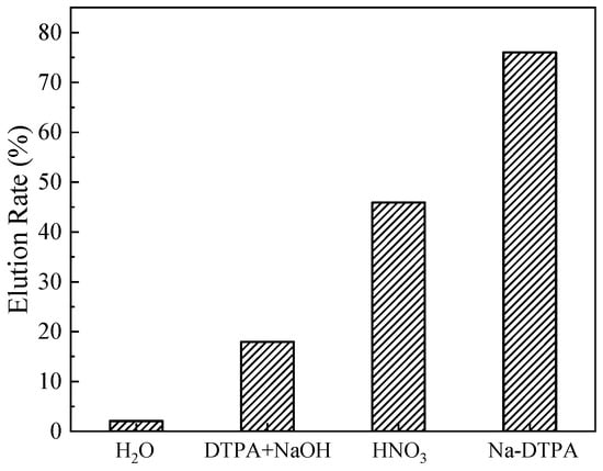 The Sr(II) elution rates of various eluents to (DtBuCH18C6 + DBS + dodec)/SiO2-P are shown in Figure 3. Compared to the deionized water, nitric acid, and DTPA+NaOH mixture, solutions of Na-DTPA exhibited the best recovery rate, up to 76.03%. According to our previous investigation, the adsorbed Sr(II) onto DtBuCH18C6-loaded resin could be eluted with deionized water []. However, H2O showed an invalid elution ability with regard to the DBS-modified adsorbent. In addition, 1 mol/L HNO3 recovered only 45.90% of the adsorbed Sr(II) onto the (DtBuCH18C6 + DBS + Dodec)/SiO2-P adsorbent, and the low Sr(II) recovery rate would result in the poor reuse performance of the material. The elution behaviors of the deionized water and nitric acid could be explained as follows: the DBS modifier could offer the coordination anion for the Sr(II) complexation of DtBuCH18C6, thus leading to the low desorption efficiency of the deionized water and nitric acid to the DBS-modified adsorbent [].
