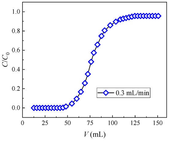 In accordance with the Runge–Kutta numerical methods, in conjunction with the column adsorption experiment conditions, the equations of the developed theoretical model were resolved. The comparison of the model fitting curves with the experimental data is shown in Figure 5. The theoretical model curves were consistent with the experimental breakthrough curves, suggesting that the numerical model could feasibly predict the dynamic adsorption process. The close values of the 5% and 100% breakthrough periods obtained through the model fitting and the experiment data further proved the appropriate model development and parameter calculations (Table 4). The similar results of prediction and experimental data at 0.5 mL/min in our previous work also proved the feasibility of a reasonable mechanical model and appropriate calculations of the parameters.