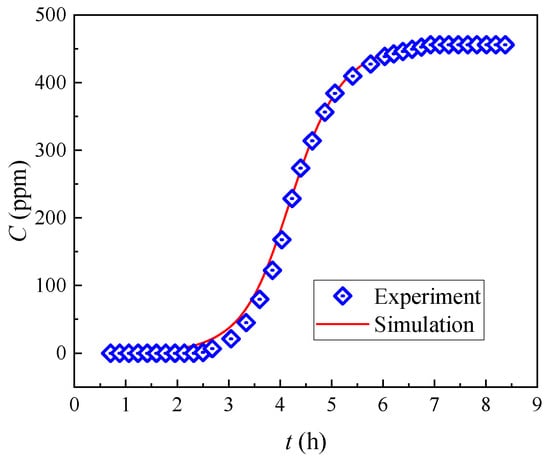 As shown in Figure 5, the 5% breakthrough period of 0.3 mL/min was 3.05 h. Based on the dynamic adsorption results of (DtBuCH18C6 + DBS + dodec)/SiO2-P under the considered flow rate used in designing the adsorption column theoretical model, the involved coefficient Kfa of the theoretical model was calculated using Equation (15), and the adsorption isotherm parameters were obtained through Freundlich model fitting []. The calculated parameters of the built final column theoretical model are listed in Table 3.