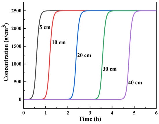 In the actual separation process, the increasing length of the adsorption column in simulation experiments would lead to problems such as a long reaction cycle time, lower experimental efficiency, and higher costs. This problem is especially serious in radioactive conditions, thereby limiting the development of a large number of experiments. The length of the column also affects the loading amount of the adsorbent and the column pressure. With the use of the constants from the above simulation, the breakthrough curves of different bed heights were calculated at a flow rate of 0.3 m3/min (Figure 6). Given the high affinity of crown ether for Ba(II), with the assumption that Ba was totally co-adsorbed as Sr in HLLW, the initial concentration of the feed solution was calculated as 2500 g/m3 (PWR, 235U:4.5%, burnup: 4.5 × 104 MW/t, 5 years cooling down) []. As seen in Figure 5, the breakthrough curve was a regular shift with a column length change. The 5% breakthrough time increased from 0.43 to 4.6 h in column lengths ranging from 5 to 40 cm. The longer column contributed to a longer breakthrough time and a larger processing volume for one cycle. This result is similar to the results of Fujie et al. []—that is, a standard breakthrough curve would appear to move parallel to the time axial under constant flow velocity and sufficiently long column condition. Under specific experimental conditions, the appropriate design of the adsorption column length is of great significance for improving adsorbent utilization and economy. The column was proposed to have a length of around 40 cm, according to our previous study, so that the requirements of efficient processing and a relatively large processing volume could be optimized. The effect of the column’s height/diameter ratio and heat transfer should be clarified in detail in our subsequent studies.