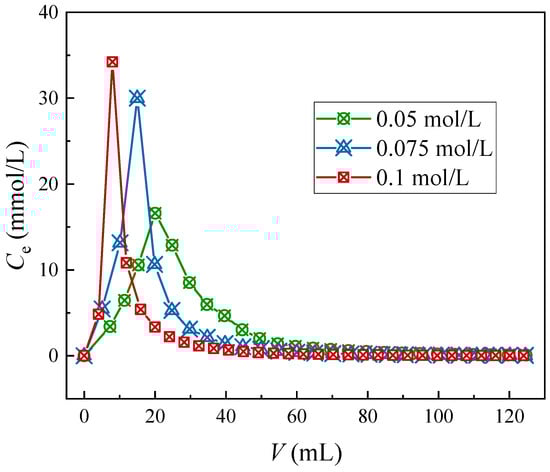 In accordance with the Sr(II) desorption performance of the considered four elutes to the (DtBuCH18C6 + DBS + dodec)/SiO2-P adsorbent in the above section, the Na-DTPA solution was utilized to further investigate the dynamic Sr(II) elution ability of the test column. The dynamic ionic elution properties of varying concentrations of the Na-DTPA solution to the adsorption column are described in Figure 7.