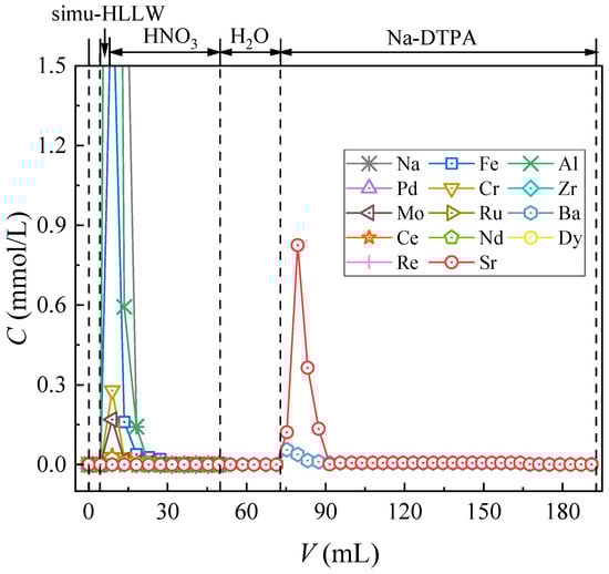 Aside from the elements of Sr(II) and Ba(II), all rested impurity nuclides were eluted from the adsorption column after 3 mol/L nitric acid solution feeding. The similar chemical properties of Ba (II) and Sr (II) led to the simultaneous adsorption of Ba (II) on (DtBuCH18C6 + DBS + dodec)/SiO2-P []. Flowing of a 20 mL nitric acid solution could successfully achieve the separation of Sr(II) with most coexisting cations in the SHLLW, indicating the excellent Sr(II) dynamic selective adsorption capacity of (DtBuCH18C6 + DBS + dodec)/SiO2-P. With the better elution efficiency of the Na-DTPA solution to Sr(II) under low acidity, the deionized water was retained for use after the feeding of HNO3 to decrease the H+ concentration of the filled layers. Sr(II) remained anchored in the column after the offering of water proved that the modification of DBS resulted in a wider acidity range of DtBuCH18C6-loaded SiO2-P material, and the adsorbent exhibited good Sr(II) adsorption performance at low acidity. The recovery rate of each element is shown in Table 5. All nuclides could achieve a recovery of more than 80%, and the rate of Sr(II) exceeded 99%, which revealed that Sr(II) could be successfully separated from HLLW through the (DtBuCH18C6 + DBS + Dodec)/SiO2-P adsorption column.
