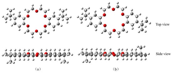 Two geometric models of 4,4′-di-tert-butylcyclohexane-18-crown-6 and 4,5′-di-tert-butylcyclohexane-18-crown-6 structures were established by using GaussView 6.0 software to derive a further understanding of the complexation properties of DtBuCH18C6 to metal ions [] (Figure 9). The ESP diagrams of the ground state obtained after the optimization of the built models are presented in Figure 10, and the red and blue regions in the picture indicate the positive and negative ESP areas of DtBuCH18C6, respectively. The centers of the DtBuCH18C6 structures exhibited a relatively low ESP, revealing the distribution of the main adsorption sites.
