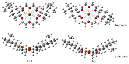 On the basis of the ESP results of the optimized DtBuCH18C6 structure, DtBuCH18C6-Sr(II) complexation models were developed, and the Sr(II) atom was set in the center of the crown ether ring. Figure 11 displays the geometric optimized DtBuCH18C6-Sr(II) complexation models. The frequency calculation results showed that no virtual frequency existed, indicating the complexation models after optimization were the most stable structures. Sr(II) remained in the center of the DtBuCH18C6 ring and close to the oxygen atoms inside the crown ether ring, and the center-to-center distances of the Sr-O bonds varied from 2.63 Å to 2.80 Å, indicating that DtBuCH18C6 was mainly dependent on the adsorption sites of the oxygen atoms to realize the complexation ability of Sr(II). In addition, both optimized complexation structures were almost identical, presenting with unidirectional bending of the crown ether structure. This finding reveals the similar Sr(II) complexation capacity of the two DtBuCH18C6 structures.