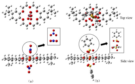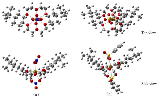 On the basis of the ESP mapping images, the ionic coordination models of DtBuCH18C6-Sr(II) with BSA or the nitrate ligands (Figure 13) were established, and the optimized structures of the two coordination models are shown in Figure 14. The frequency calculation results showed no virtual frequency, indicating that the optimized model possessed the most stable structure. Therefore, both DBS and nitrate ions can be complexed with DtBuCH18C6-Sr(II) through a bidentate coordination mode. With the exception of the misattributed C atoms, the total coordination number of Sr(II) inside each coordination model was calculated to be 14, including 10 O atoms and 2 S or N atoms, which is consistent with the optimized structure.