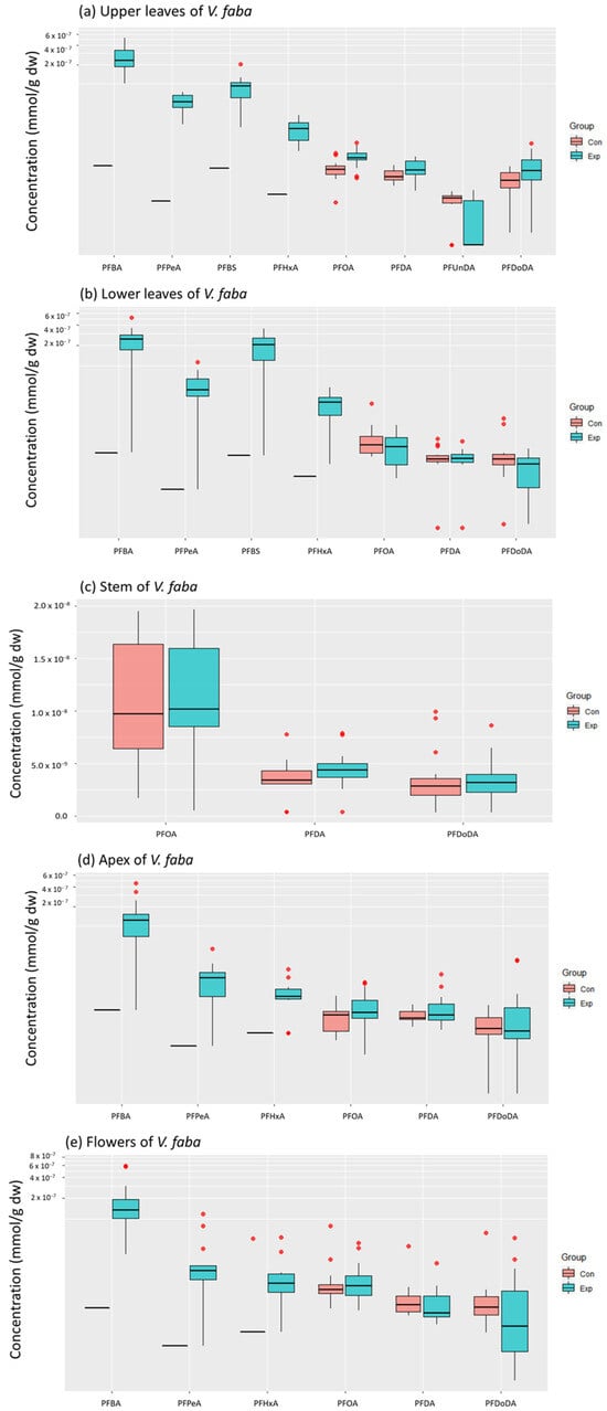 PFAS concentrations (mmol/g dw) in (a) upper leaves (n = 13 for control, n = 14 for exposed), (b) lower leaves (n = 15 per treatment), (c) stem (n = 15 per treatment), (d) apex (n = 15 per treatment), and (e) flowers (n = 13 for control, n = 15 for exposed) of exposed (Exp, blue) and control (Con, red) plants of V. faba. Outliers are indicated as red data points. Only compounds detected in at least 2/3 of the samples were included.