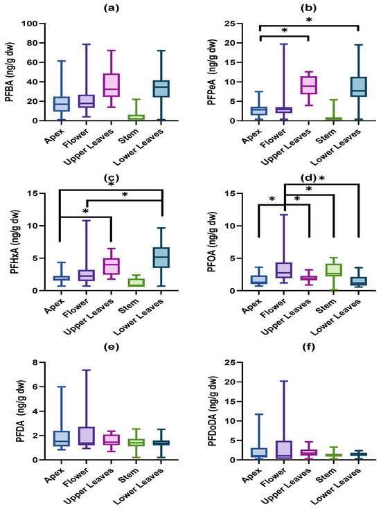 Concentrations (ng/g dw) of (a) PFBA, (b) PFPeA, (c) PFHxA, (d) PFOA, (e) PFDA, and (f) PFDoDA in exposed tissues of V. faba. n = 15 for apex, flower, stem and lower leaves, n = 14 for upper leaves. Significant differences among tissues are displayed by an asterisk.