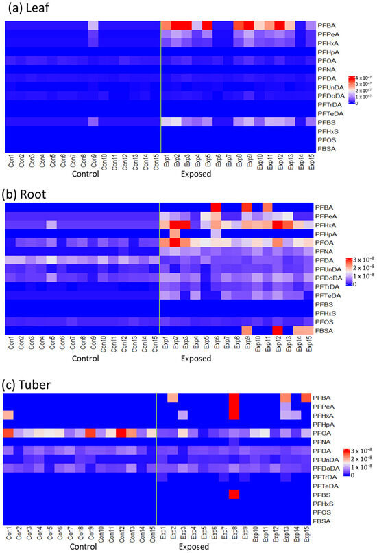 Heatmaps representing the relative PFAS concentrations in R. raphanistrum in mmol/g dw. The highest PFAS concentrations are shown in red, whereas the lowest concentrations are shown in blue. (a) concentrations in leaves; (b) concentrations in root; (c) concentrations in tubers. Con = control, Exp = exposed. n = 15 per treatment. The green line in each heatmap separates the control (Con) and exposed (Exp) plants on the x-axis.