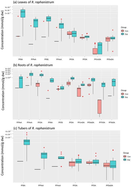 PFAS concentrations (mmol/g dw) in (a) leaves, (b) roots, and (c) tubers of exposed (Exp, blue) and control (Con, red) plants of R. raphanistrum. Outliers are indicated as red data points. Only compounds detected in at least 2/3 of the samples were included. n = 15 per treatment.