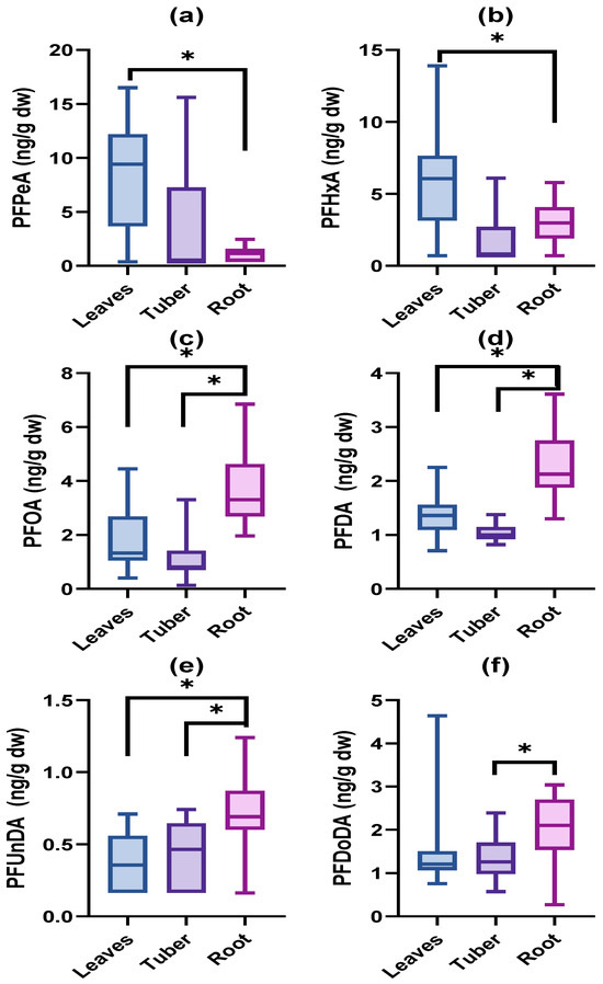 Concentrations of PFOA, PFDA, and PFUnDA were highest in the roots (p < 0.05; Figure 6c–e), followed by the leaves and the tubers, which did not differ from each other for neither of the three PFASs. PFDoDA concentrations were significantly (p < 0.05; Figure 6f) higher in the roots than in the tubers, but no other differences among tissues were observed. PFPeA and PFHxA concentrations could only be statistically compared between leaves and roots due to the low detection in the tubers. The concentrations of both PFASs were significantly (p < 0.05, Figure 6a,b) higher in the leaves than in the roots.