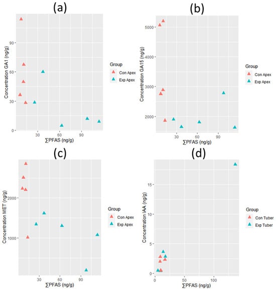 Correlations between hormone levels (ng/g dw) and ∑PFAS concentrations (ng/g dw) in the apex of V. faba ((a) (GA1, n = 10), (b) (GA15, n = 10), and (c) (MET, n = 10)) and tuber of R. raphanistrum ((d) (IAA, n = 8)). Controls are shown in red, whereas exposed plants are shown in blue.