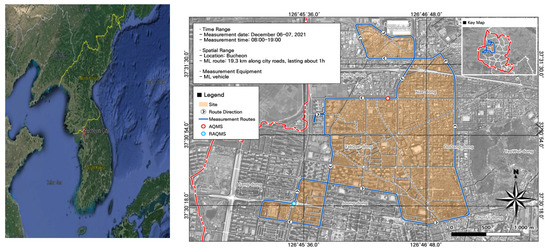 To select our study site, we reviewed the results of a hotspot analysis from the literature [4]. The site was adjacent to the Gyeongin Expressway and the Capital Region First Ring Expressway, and also near the Nae-dong AQMS station and Songnae-daero RAQMS station. We selected a survey route that passed near industrial complexes and a specially managed road (roads with severe traffic congestion) (Figure 1).