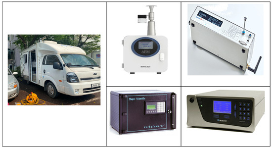 For gas-phase pollutants, we followed the so-called Korean air pollution process test method. This method recommends using gravimetry and beta-ray absorption to measure fine dust in the atmosphere; however, for mobile measurements, we used light-scattering measurement methods to obtain faster responses. Black carbon (BC) is used as an indicator of automobile emission pollution; we measured BC using an AE51 aethalometer (Magee Scientific, Berkley, CA, USA). We also used a GPS system to determine the spatial coordinates of measurements according to vehicle movement to prevent measurement errors due to time differences among measurement devices (Table 1).