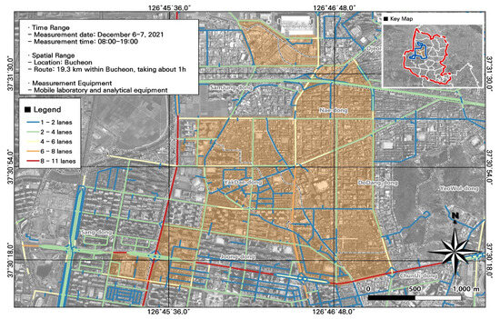 The mobile measurements were taken along a predetermined route, which started and ended at the Bucheon Technopark, Yakdae-dong; before operation, the equipment was inspected and the battery was charged.
