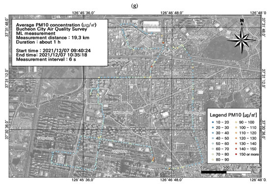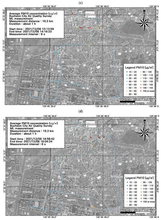 Among the seven measurement runs, the highest PM10 concentration (91.8 ± 17.6 µg/m3) was detected during typical evening rush hour, followed by morning rush hour (79.6 ± 19.7 µg/m3) (Figure 5a,e; Table 3). The spatiotemporal distributions confirmed high PM10 concentrations during commuting hours in the areas near the Nae-dong, Gyeongin-ro, and Ojeong-dong ready-mix concrete complex. During morning rush hour, the highest PM10 concentration was 190 µg/m3 in the Nae-dong and Gyeongin-ro areas. During evening rush hour, the highest PM10 concentration was 200.7 µg/m3 in the areas of the Nae-dong, Gyeongin-ro, and Ojeong-dong ready-mix concrete complex. These findings confirm high contributions of roadside mobile emissions to air pollution; accordingly, careful management of these areas is necessary during commuting hours.