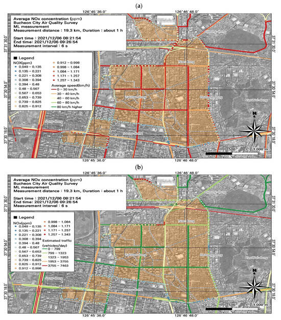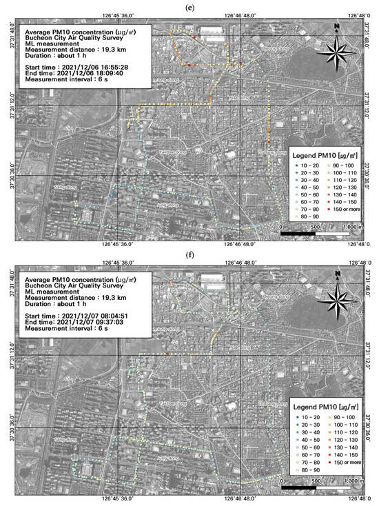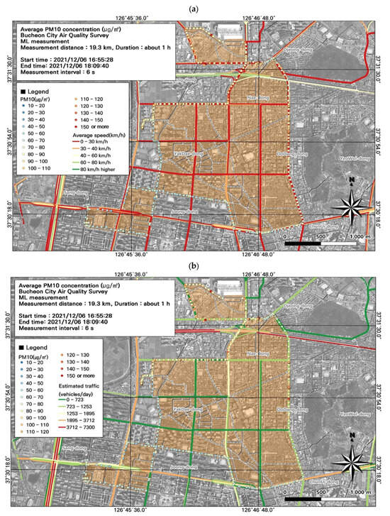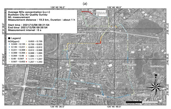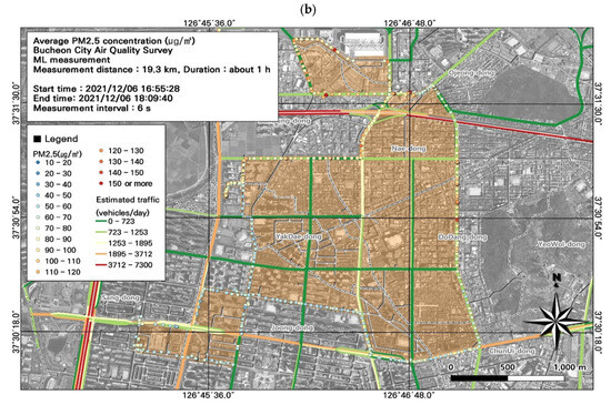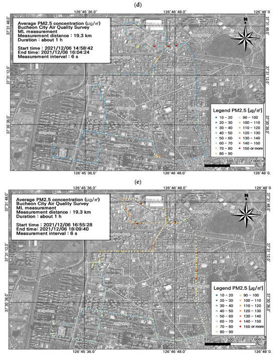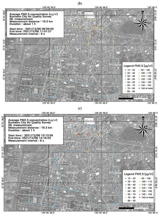 This study was conducted in winter (December), which experiences among the highest seasonal fine dust concentrations. Because Bucheon does not have large-scale facilities with high emissions, atmospheric pollutants derived from fossil fuels (e.g., BC, NO, NO2, and NOx) are mainly emitted from mobile sources. We found that the ML-measured PM10 and PM2.5 concentrations were similar to those from the AQMS. Moreover, our spatiotemporal analysis indicated that vehicles were the main source of PM10 and PM2.5. Temporally, particulate and gaseous pollutant concentrations were high during commuting hours. Spatially, within the study area, the specially managed road had high pollutant concentrations. Our GIS-based visualization of pollution levels overlayed with road level, traffic (average and during congestion), and estimated traffic volume data simplified the identification of pollution hotspots. GIS enables the comparison of multiple environmental variables, and can support the establishment of air quality management measures. Although the instruments used in this study have first-grade measurement certifications, due to the limitations of light-scattering-based measurements, which can vary depending on the physicochemical characteristics of particles, we used the data for comparisons of regional spatiotemporal distribution to confirm the accuracy of measured concentrations.