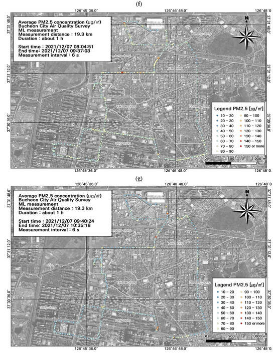 Spatial and temporal plots of ultrafine particulate matter (PM2.5) concentrations measured using the mobile laboratory (ML): (a) 6 December, first run; (b) 6 December, second run; (c) 6 December, third run; (d) 6 December, fourth run; (e) 6 December, fifth run; (f) 7 December, first run; (g) 7 December, second run.