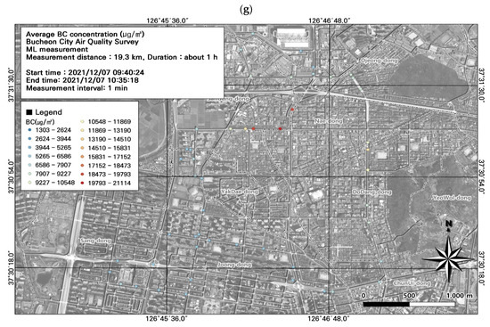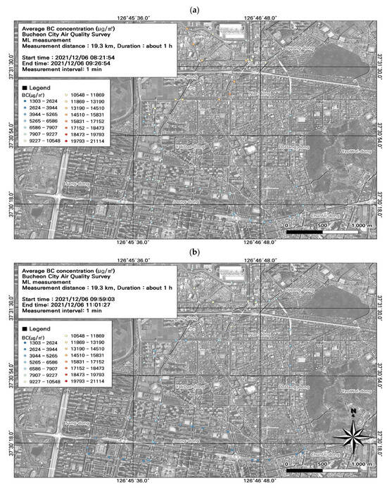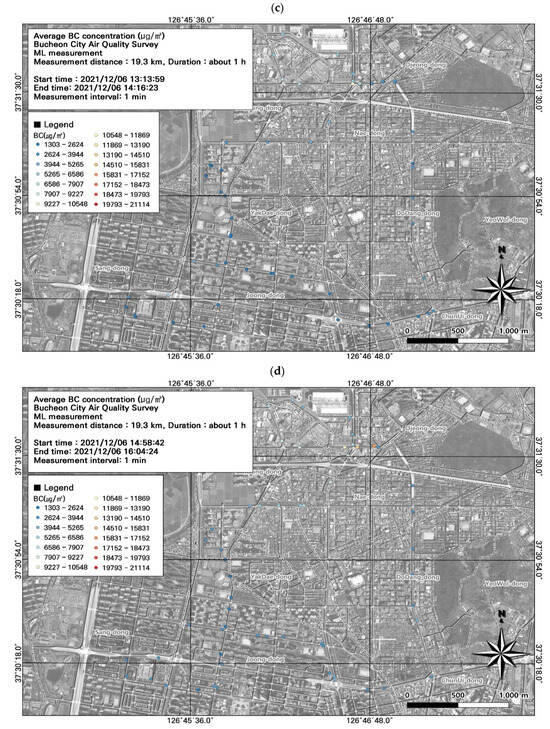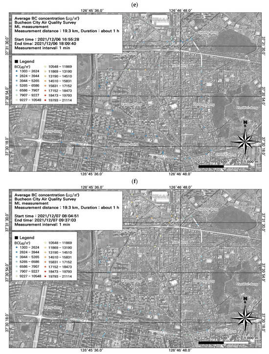 Among the seven ML datasets, the highest average BC concentration was measured during the morning rush hour (8722.0 ± 2660.7 µg/m3) (Figure 9; Table 4), followed by the evening rush hour (7889.2 ± 3283.4 µg/m3). During commuting hours, the highest measurement was 16,139 µg/m3 at the Nae-dong intersection on December 6; on December 7, the highest daily BC concentration was 14,716 µg/m3. Overall, BC concentrations were higher during commuting hours. BC is a particulate pollutant used as an indicator of automobile emissions. However, BC concentrations are measured over 1 min intervals, and only average levels for the entire interval can be measured. Accordingly, it is necessary to consider the spatiotemporal distribution of BC in combination with PM, which can be measured at shorter intervals.