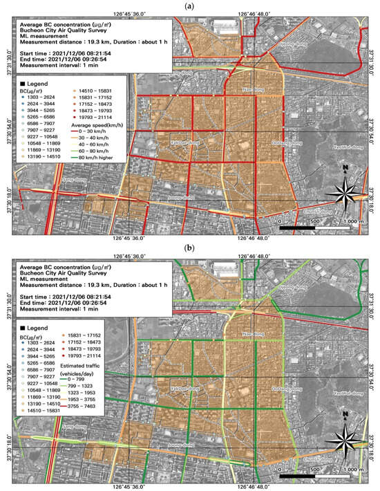 We subsequently performed a spatial analysis using the data during morning rush hour (Figure 9) to identify areas with particularly high BC concentrations (Figure 10). Because BC concentrations were measured at 1 min intervals, we could not perform a detailed comparison. Traffic was congested along the entire study route, and the average traffic speed was 0–30 km/h. Based on the comparison of traffic volume estimates and BC concentrations, the areas near Nae-dong and Gyeongin-ro had relatively high BC concentrations, and experienced elevated traffic volumes of 1323–1953 vehicles/day. Moreover, BC concentrations were relatively high at intersections. These findings highlight the importance of examining BC along with PM10 and PM2.5 when investigating vehicle emissions.