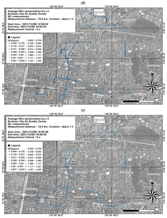 NOx concentrations are widely used as an indicator of road emissions. Our findings revealed that the 24 h average NO2 concentration (0.06 ppm) exceeded air quality standards. Among the seven ML datasets, the NOx concentration was highest during the morning rush hour (0.50 ± 0.20 ppm), and the NO2 concentration was highest during the morning and evening rush hour (0.08 ± 0.03 ppm) (Figure 11; Table 5). The spatiotemporal distributions revealed high NOx concentrations during commuting hours, with maximum concentrations of 1.34 ppm for NOx, 0.18 ppm for NO2, and 1.18 ppm for NO. Although the NOx concentrations were measured at 1 s intervals, enabling a detailed spatiotemporal analysis, some points overlapped spatially; therefore, we modified the data to plot the NOx values at 6 s intervals, the same as the PM2.5 and PM10 results.