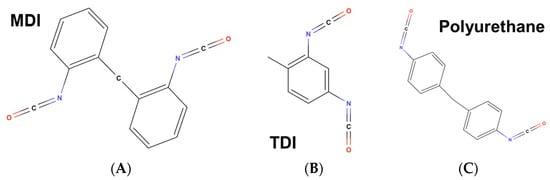 - Schupp, T.; Plehiers, P.M. Absorption, distribution, metabolism, and excretion of methylene diphenyl diisocyanate and toluene diisocyanate: Many similarities and few differences. Toxicol. Ind. Health 2022, 38, 500–528. [Google Scholar] [CrossRef]