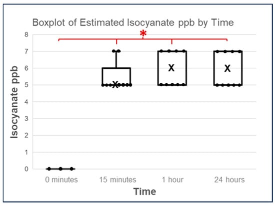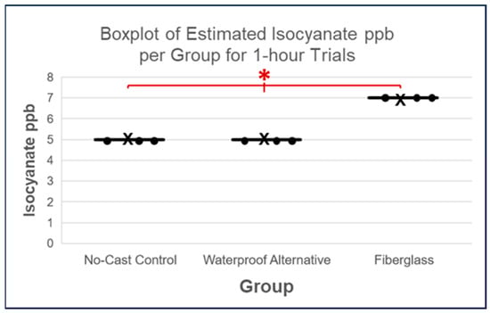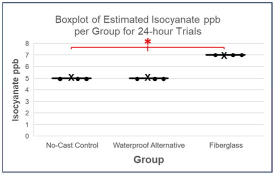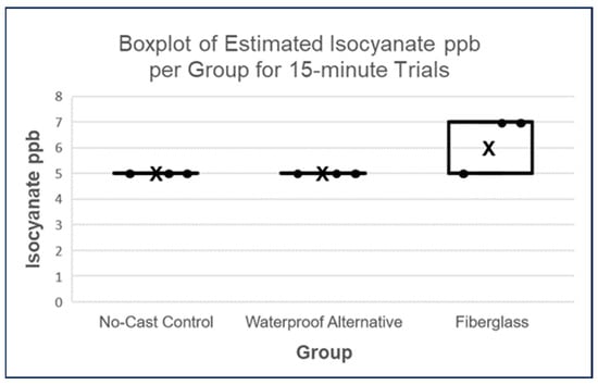 Chicago/Turabian StyleStefanescu, Kristen, Claire L. Timlin, Ashley S. Moy, and Grzegorz Zapotoczny. 2023. "Reduced Isocyanate Release Using a Waterproof, Resin-Based Cast Alternative Relative to Fiberglass Casts" Toxics 11, no. 12: 1002. https://doi.org/10.3390/toxics11121002