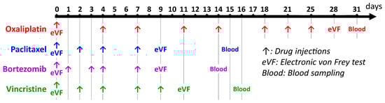 Oxaliplatin (Leancare, Conwy, UK) was administered intravenously eight times (2 mg/kg) on days 0, 4, 7, 11, 14, 18, 21, and 25, resulting in a cumulative dose of 16 mg/kg (Figure 1). For each injection, oxaliplatin was diluted to 2 mg/mL in a 5% glucose solution from a 4 mg/mL stock solution (solvent: 5% glucose) []. Control animals received the same volume of the vehicle (5% glucose).