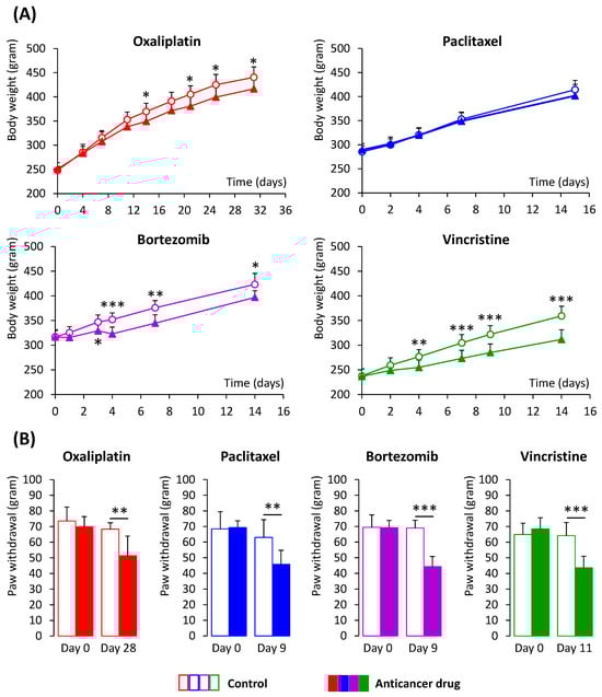 Oxaliplatin-, bortezomib-, and vincristine-treated animals (not paclitaxel-treated animals) presented a lower body weight than the control animals starting from day 14 for oxaliplatin, day 3 for bortezomib, and day 4 for vincristine, and until the end of the experiment (Figure 3A).