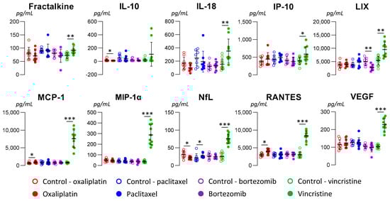 Finally, none of the variations in biomarker concentrations (increase or decrease) were similar between animal models of CIPN. Only the MCP-1 and RANTES concentrations showed a similar increase both in oxaliplatin- and vincristine-treated animals; likewise for NfL concentrations for paclitaxel- and vincristine-treated animals. Moreover, LIX concentrations presented opposite variations between bortezomib- and vincristine-treated animals, and similarly for NfL concentrations for oxaliplatin- and for both paclitaxel- and vincristine-treated animals.