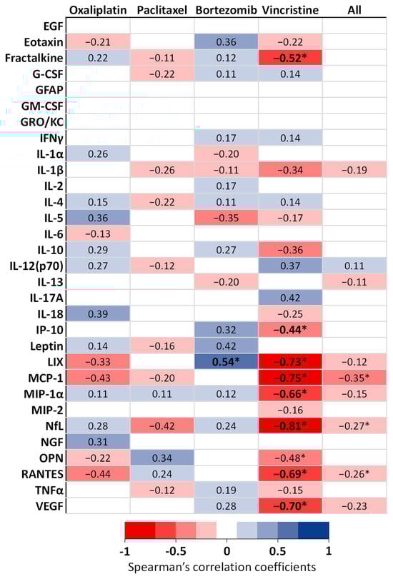 Heatmap of the correlations between the serum concentrations of biomarkers and tactile allodynia thresholds after the end of anticancer injections, and for each anticancer drug. Correlation coefficients were calculated between tactile allodynia thresholds on day 28 for oxaliplatin, on day 9 for paclitaxel, on day 9 for bortezomib, and on day 11 for vincristine, and biomarker concentrations, including all the animals (controls and anticancer drug-treated animals). * p < 0.05.