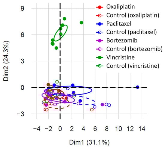 A factorial analysis of mixed data was conducted on selected quantitative and qualitative variables (for details, see Figure 6) to explore the relationship between different variables to determine whether they have an impact on each other and, here, to explore whether the concentrations of biomarkers would aid in discriminating CIPN models. The model used was able to report data in a two-dimensional plot diagram (Figure 6). In this analysis, all the vincristine-treated animals (green full dots, Figure 6) were isolated from other animals (control and anticancer drug-treated animals), whereas nearly all the animals (control and anticancer-treated animals) of other animal models were plotted together. Interestingly, the three control animals of the paclitaxel model tended to be isolated from other animals (observation to be interpreted with caution).