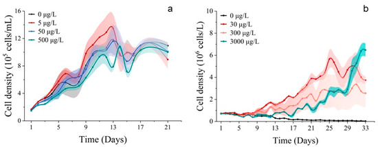 Population growth curves of phytoplankton. (a) Exposed for 21 d to different concentrations of Co2+ on S. costatum. (b) Exposed for 33 d to different concentrations of Co2+ on P. donghaiense. Mean value standard error bars (n = 3). The shadow area denoted the standard deviation.