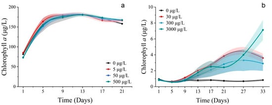 Concentrations of chlorophyll a of phytoplankton. (a) Exposed for 21 d to different concentrations of Co2+ on S. costatum. (b) Exposed for 33 d to different concentrations of Co2+ on P. donghaiense. Mean value standard error bars (n = 3). The shadow area denoted the standard deviation.