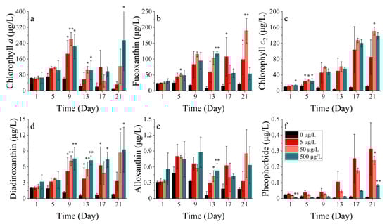 Pigment concentrations of (a) chlorophyll a, (b) fucoxanthin, (c) chlorophyll c2, (d) diadinoxanthin, (e) alloxanthin and (f) pheophorbide on S. costatum in different concentrations of nickel. * and ** indicates significant and highly significant differences between the experimental addition group and the control group on the same day, respectively (p < 0.05, p < 0.01).