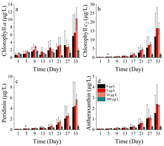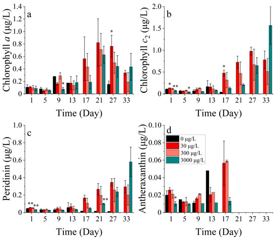 Pigment concentrations of (a) chlorophyll a, (b) chlorophyll c2, (c) peridinin, and (d) antheraxanthin at P. donghaiense in different concentrations of nickel. * indicates a significant difference between the experimental addition group and the control group on the same day (p < 0.05).