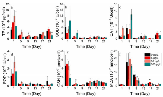 Enzyme concentrations of (a) TP, (b) SOD, (c) CAT, (d) POD, (e) GSH and (f) MDA on P. donghaiense in different concentrations of cobalt.